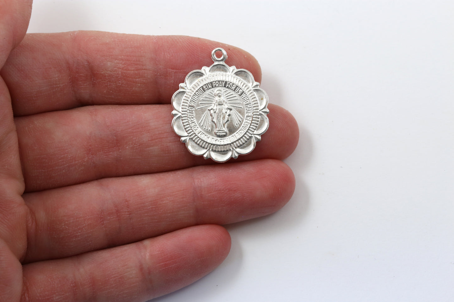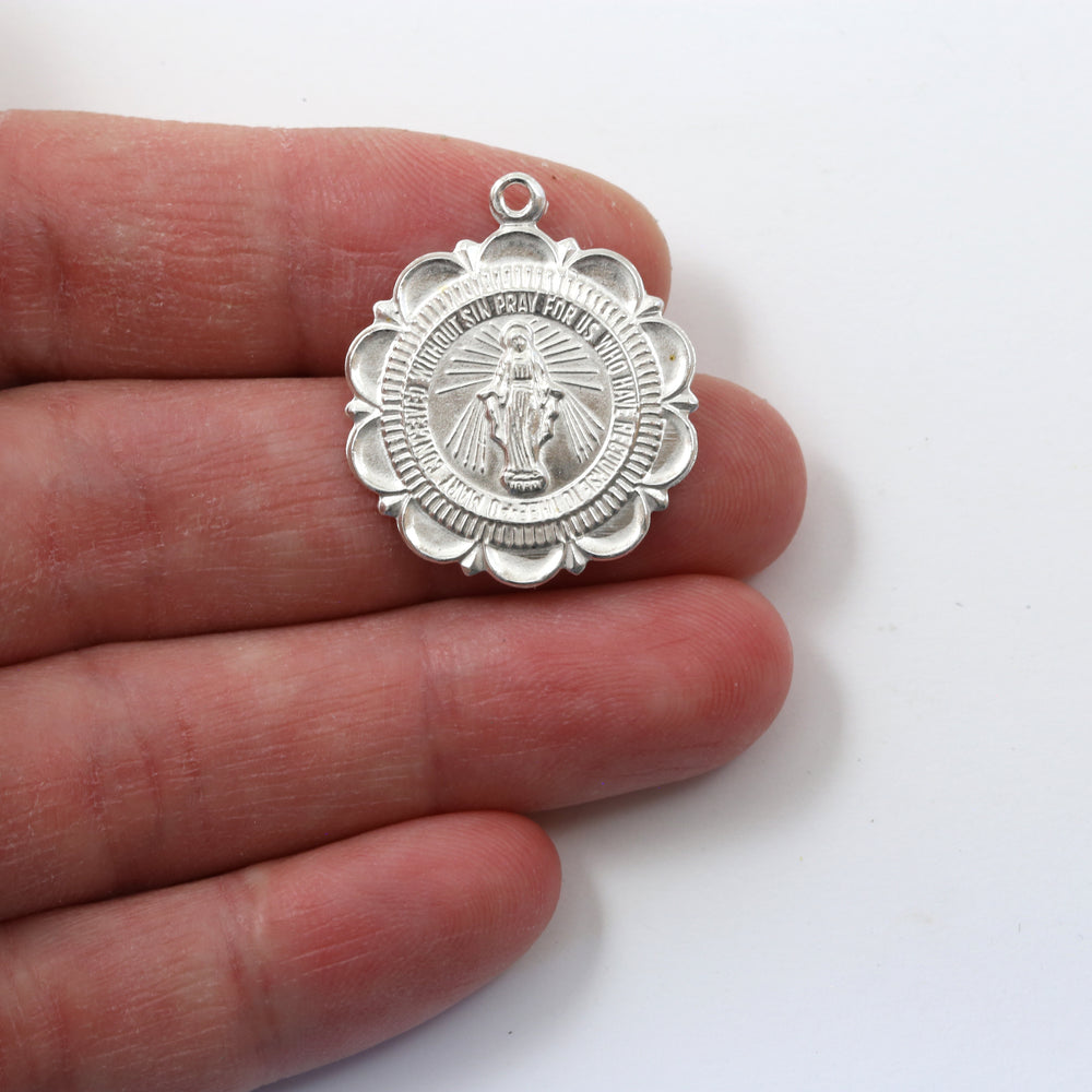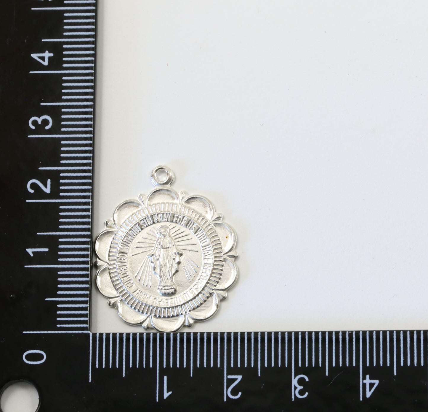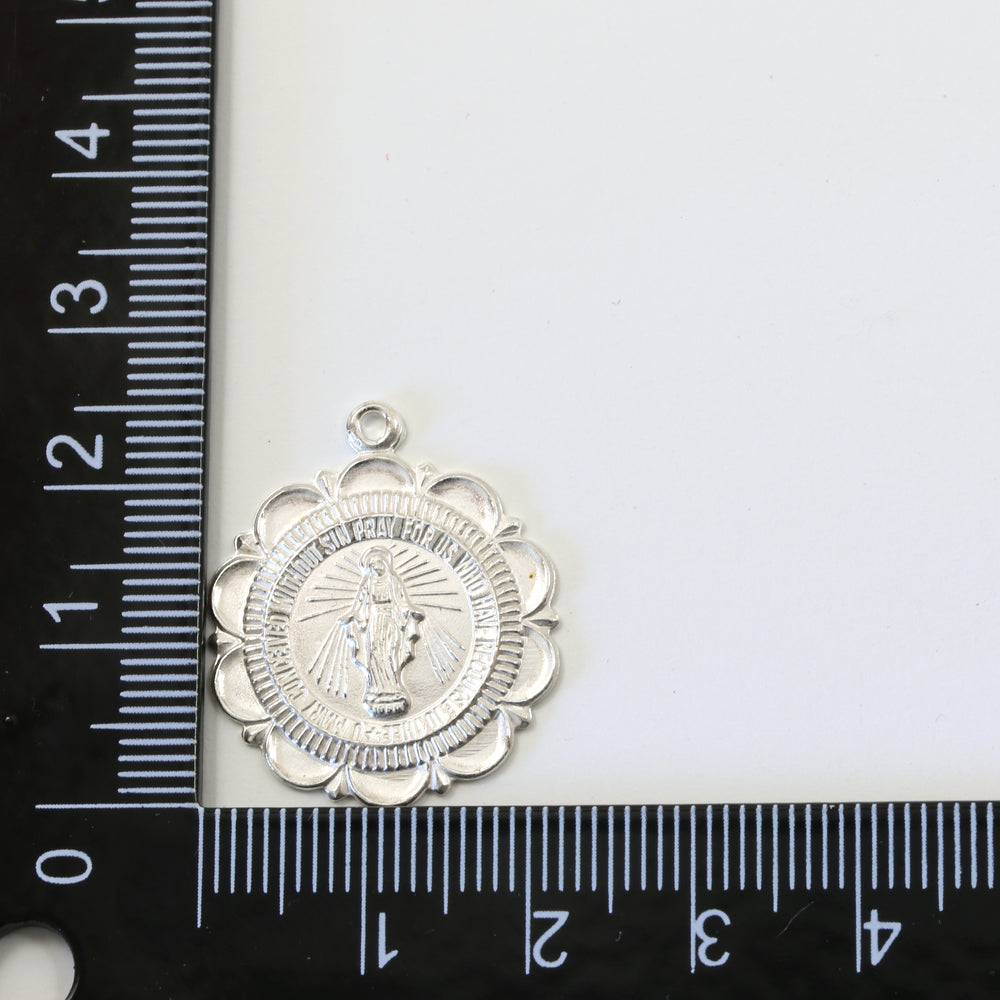 Sterling Silver Round Scalloped Virgin Mother Mary Miraculous Medal Charm 22mm